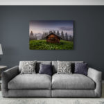 Dieses atmosphärische Wandbild entführt in die friedvolle Abendstimmung der Alpen und präsentiert eine malerische Almhütte vor der eindrucksvollen Kulisse der Bischofsmütze. Die untergehende Sonne taucht die Szene in ein weiches Licht und betont die stille Harmonie zwischen der urigen Hütte und der majestätischen Berglandschaft. Der Nebel, der sich sanft um die Wipfel der Tannen legt, fügt dem Bild eine geheimnisvolle Tiefe hinzu und lässt die Szenerie fast unwirklich erscheinen.
