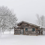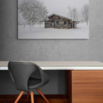 Hütte in winterlichen Schneetreiben. Durch die minimalistischen Farben wirkt das Bild besonders gut bei moderner Architektur.
